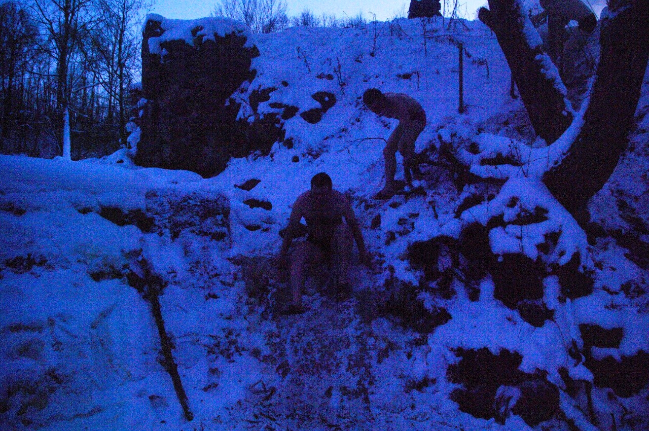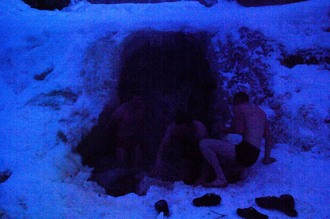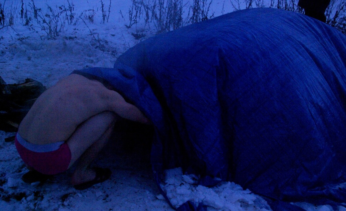 Каждый делал работу, чтобы не замерзнуть: кто-то колотил лед у водопада, расширяя окно до размера маленького бассейна, другие ребята разводили костер, остальные собирали камни для походной баньки.